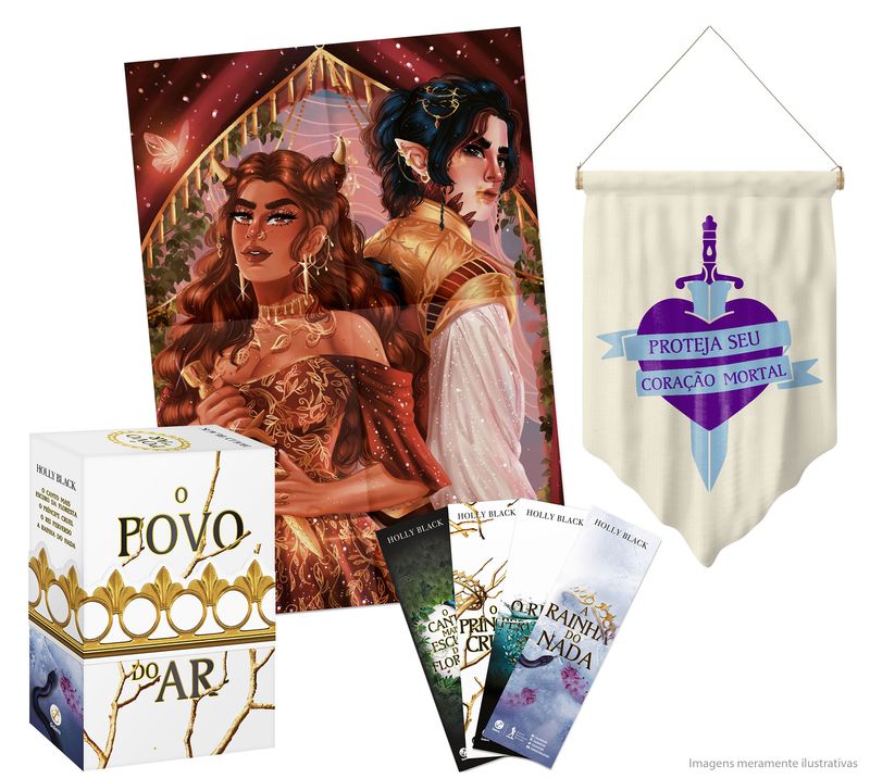 Os três volumes da série O povo do ar e o spin-off reunidos pela primeira vez em um box com conteúdos especiais. O conto inédito “As irmãs perdidas”, o mapa de Elfhame atualizado no verso das capas, uma capa nova para O canto mais escuro da floresta, e brindes como uma cinta em formato de coroa de papel, marcadores, pôster exclusivo com uma fan art da Arda Arts e uma flâmula. Na série O povo do ar, a autora best-seller Holly Black transporta os leitores para Reino das Fadas. Não aquelas dos contos clássicos, fadas que podem ser cruéis e mortais, especialmente se motivadas pelo poder. Uma aventura que mistura magia, intrigas palacianas e romance. O canto mais escuro da floresta (294 pág.) Hazel e seu irmão, Ben, moram em uma cidade onde humanos e fadas convivem. A magia aparentemente inofensiva desses seres atrai turistas de todas as partes, que querem ver de perto as maravilhas do lugar e, principalmente, o garoto de chifres e orelhas pontudas que descansa em um caixão de vidro. Hazel e Ben eram fascinados pelo garoto quando crianças. Mas, eles sabem que o garoto de chifres nunca acordará… Até que um dia ele acorda. Agora, os irmãos precisam se tornar os heróis que fingiam ser e desvendar os mistérios que envolvem aquele príncipe com chifres. O príncipe cruel (360 pág.) Jude tinha 7 anos quando seus pais foram assassinados e foi forçada a viver no Reino das Fadas. Dez anos depois, tudo o que ela quer é ser como eles – lindos e imortais – e realmente pertencer ao Reino das Fadas, apesar de sua mortalidade. Para ganhar um lugar na Alta Corte, ela deve desafiar o Príncipe Cardan, o filho mais bonito e mais cruel do Grande Rei… e enfrentar as consequências. O rei perverso (320 pág.) Jude achou que, depois de enganar Cardan para que ele jurasse obedecê-la por um ano e um dia, sua vida se tornaria mais fácil. Mas ter qualquer influência sobre o Grande Rei de Elfhame parece uma tarefa impossível, principalmente quando ele faz de tudo em seu poder para humilhá-la e prejudicá-la, mesmo que seu fascínio pela garota humana permaneça intacto. A rainha do nada (294 pág.) Jude carrega o outrora impensável título de Grande Rainha de Elfhame, mas as condições são longe de ser ideais. Exilada por Cardan no mundo mortal, Jude se encontra impotente e frustrada enquanto planeja reivindicar tudo que Cardan tomou dela.