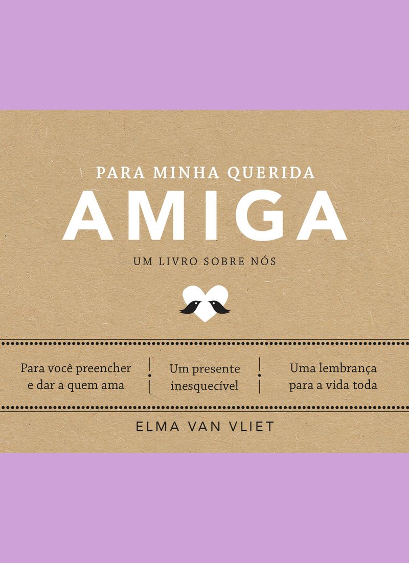 Um presente especial para você e sua amiga. A história dessa grande amizade merece virar um livro.Elma van Vliet e´ a criadora da colec¸a~o Tesouros de Fami´lia, com ti´tulos que se tornaram cla´ssicos e conquistaram o corac¸a~o de mais de 5 milho~es de pessoas em todo o mundo. Com espac¸o para escrever e colar fotos, este presente e´ uma oportunidade para voce^ registrar toda a sua admirac¸a~o por essa pessoa que esta´ sempre ao seu lado. Responda a perguntas inspiradoras, resgate boas lembranc¸as e fortalec¸a essa relac¸a~o ta~o preciosa. Celebre a be^nc¸a~o de ter uma amiga que esta´ com voce^ nas horas felizes e nas difi´ceis tambe´m.